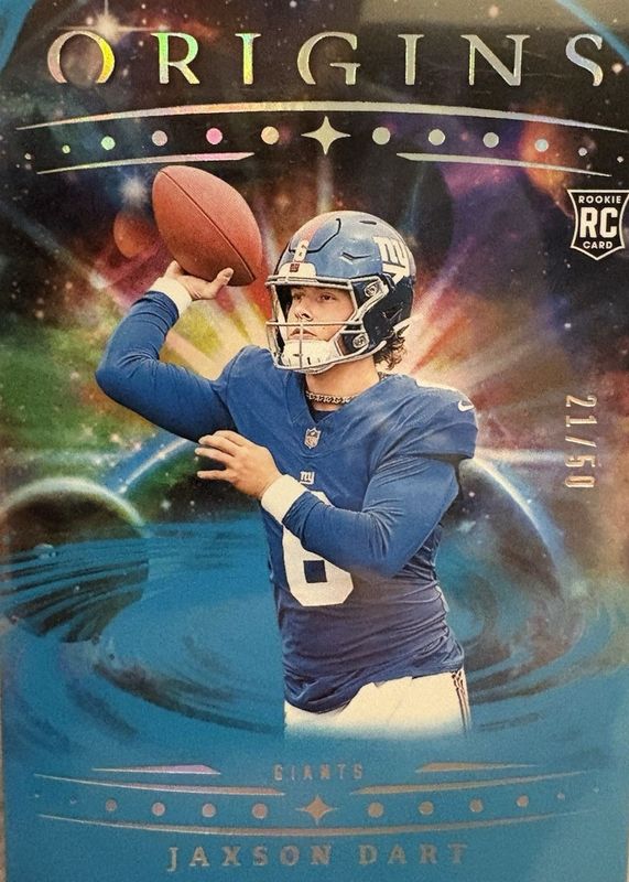 This card is 1 of 25 Jaxson Dart's card variations in the 2025 Origins set being tracked by Sports Card Investor, including Base, Holo Red /299, Holo Orange /249, Red /225, and Holo Blue /199.