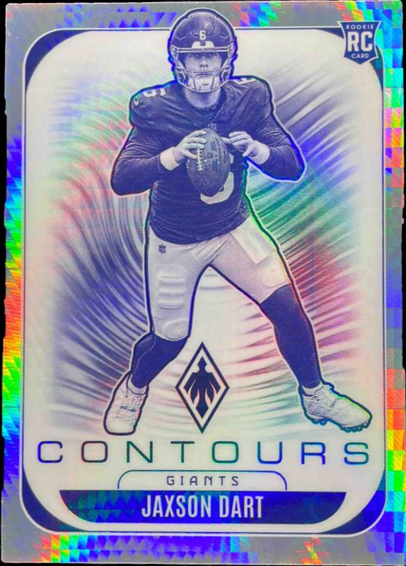 The Jaxson Dart 2025 Phoenix #24 Contours - Silver Hyper /299 Rookie card is 1 of 183 Jaxson Dart's card variations in the 2025 Phoenix set being tracked by Sports Card Investor, including Base, Silver, Silver Hyper, Silver Lava, and Silver Lazer.