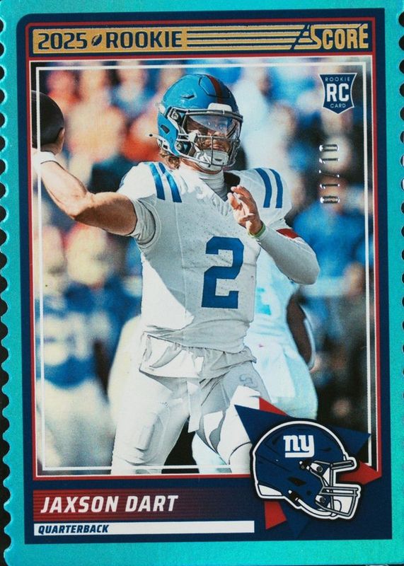 This card is 1 of 27 Jaxson Dart's card variations in the 2025 Score set being tracked by Sports Card Investor, including Base, Gold, Green, Orange, and Purple.