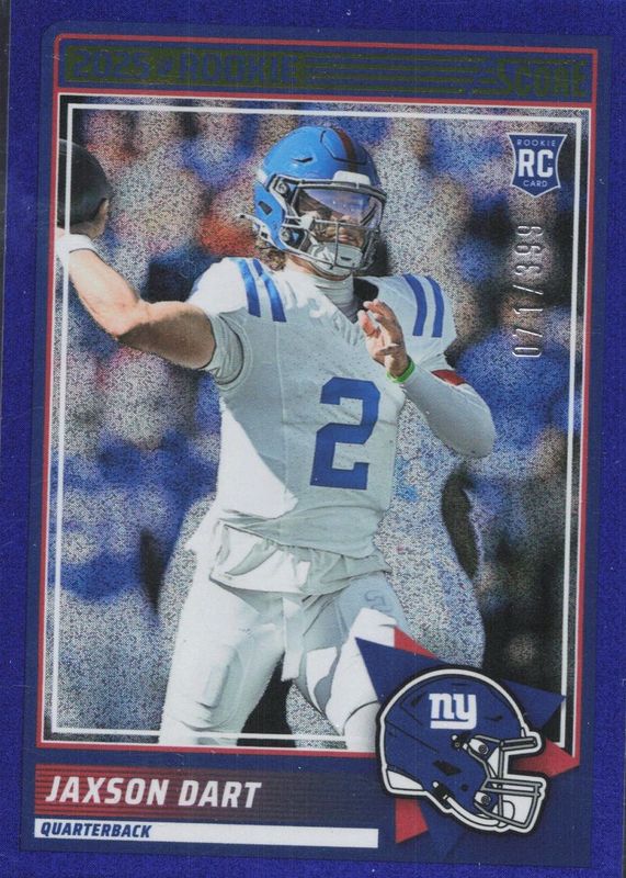 The Jaxson Dart 2025 Score #35 Dots Blue /399 Rookie card in Raw condition has not changed in price in the last 30 days and was last sold for $19.99 .