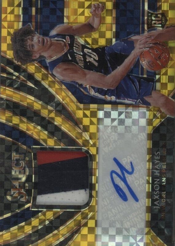 The Jaxson Hayes 2019 Select #RJA-JXH Rookie Jersey Autographs - Gold /10 card in Raw condition has not changed in price in the last 30 days and was last sold for $38.00 .