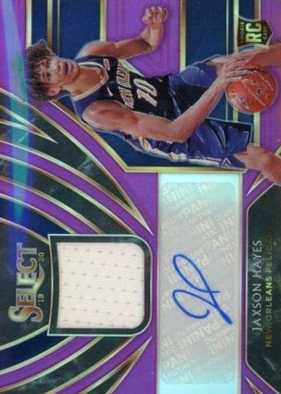 The Jaxson Hayes 2019 Select #RJA-JXH Rookie Jersey Autographs - Purple /99 card in Raw condition has not changed in price in the last 30 days and was last sold for $13.50 .