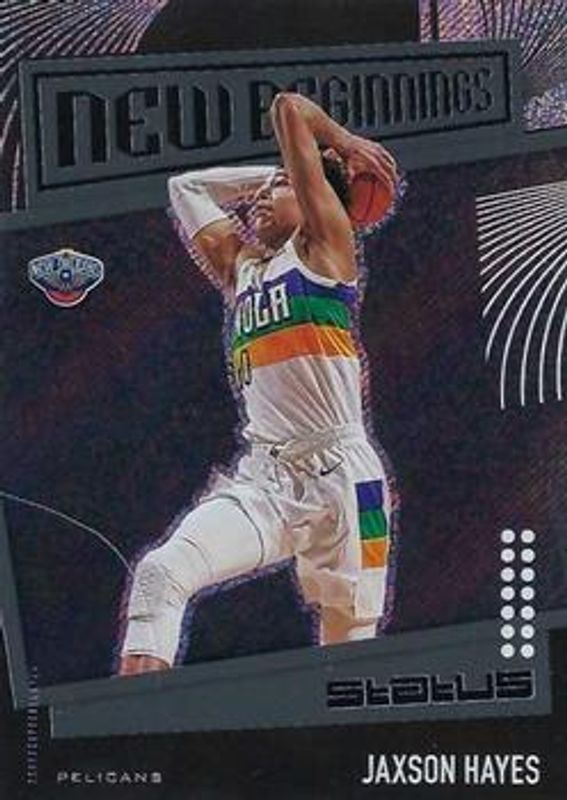 The Jaxson Hayes 2019 Status #25 New Beginnings Rookie card is 1 of 14 Jaxson Hayes' card variations in the 2019 Status set being tracked by Sports Card Investor, including Base, Blue, Red, White Diamonds /125, and Green Escher Squares /49.