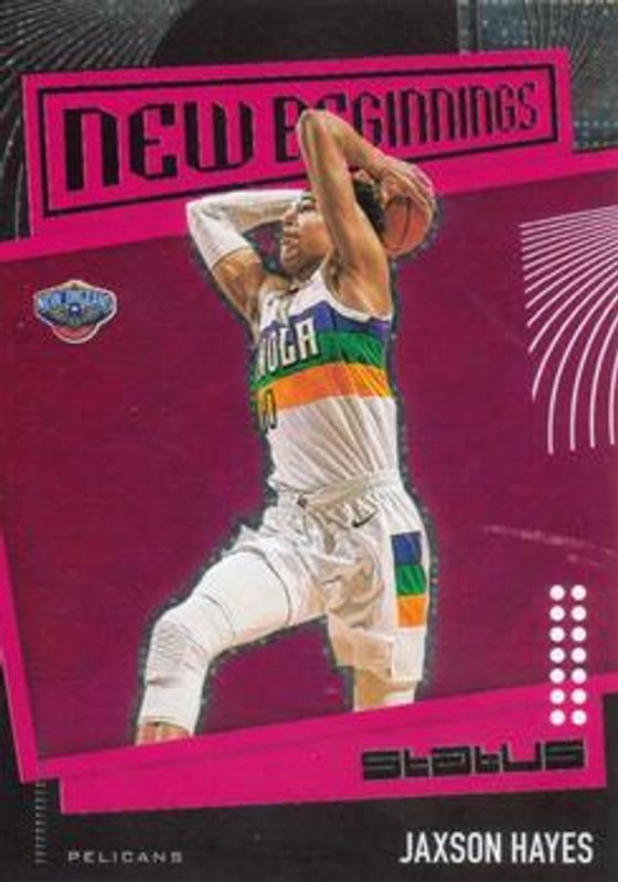 The Jaxson Hayes 2019 Status #25 New Beginnings - Red Rookie card is 1 of 14 Jaxson Hayes' card variations in the 2019 Status set being tracked by Sports Card Investor, including Base, Blue, Red, White Diamonds /125, and Green Escher Squares /49.