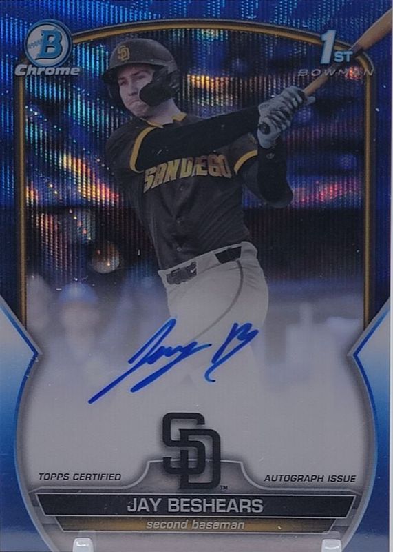 Best Prices Available For Sale of Jay Beshears 2023 Bowman Draft #CDA-JBE Chrome Prospect Auto - Blue Wave Refractor /150 (1st)