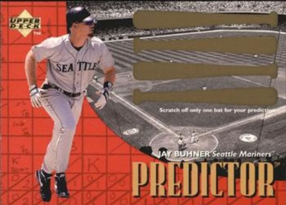 The Jay Buhner 1997 Upper Deck #P25 Predictors card is 1 of 7 Jay Buhner's card variations in the 1997 Upper Deck set being tracked by Sports Card Investor, including Base, Long Distance Connection, Power Package, Power Package 5x7, and Predictors Exchange.