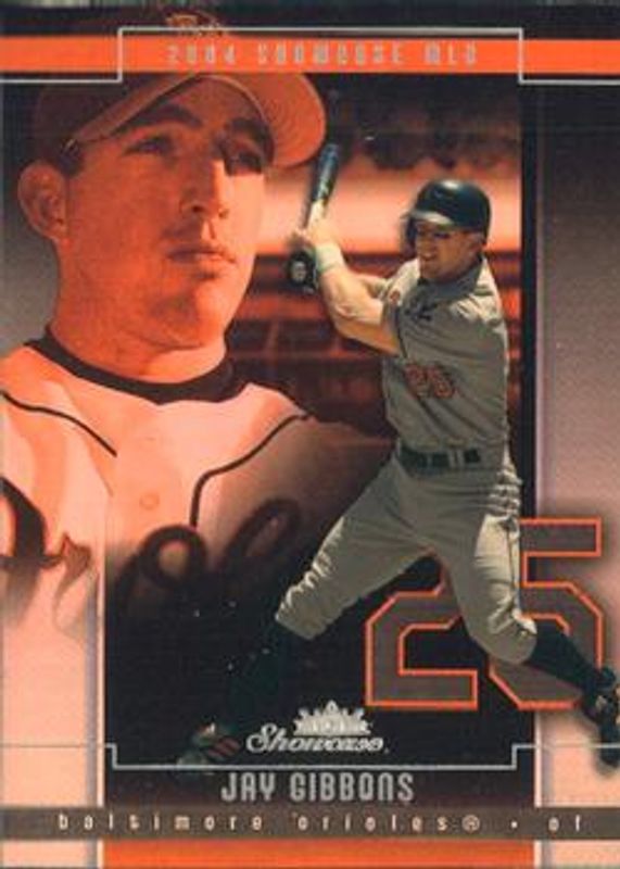 The Jay Gibbons 2004 Fleer Showcase #34 Base card is 1 of 3 Jay Gibbons' card variations in the 2004 Fleer Showcase set being tracked by Sports Card Investor, including Legacy Collection /99, and Masterpiece Collection /1.