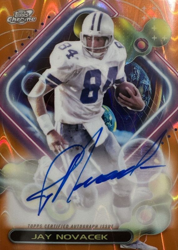 The Jay Novacek 2023 Topps Composite #CCA-JN Cosmic Autographs - Orange Galactic /25 card in Raw condition has not changed in price in the last 30 days and was last sold for $60.84 .