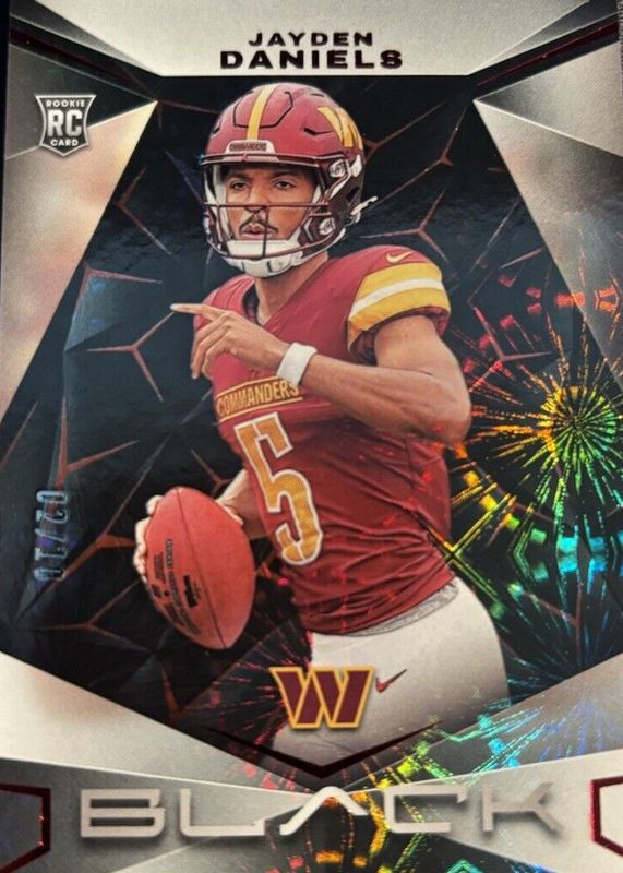 This card is 1 of 12 Jayden Daniels' card variations in the 2024 Black set being tracked by Sports Card Investor, including Base, Royal /99, Sapphire /35, Citrine /25, and Emerald /15.