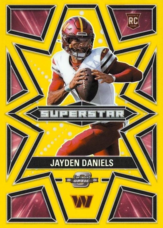 The Jayden Daniels 2024 Contenders Optic #S-JDS Superstars - Gold /10 Rookie card in Raw condition has not changed in price in the last 30 days and was last sold for $790.00 .