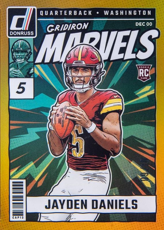 The Jayden Daniels 2024 Donruss #13 Gridiron Marvels - Gold /10 Rookie card in Raw condition has not changed in price in the last 30 days and was last sold for $3,450.00 .