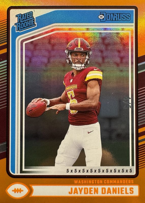 The Jayden Daniels 2024 Donruss #389 Jersey Number (/5) Rookie card in Raw condition has not changed in price in the last 30 days and was last sold for $1,525.00 .