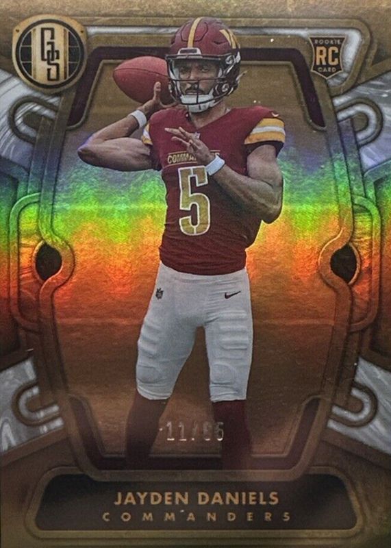 This card is 1 of 16 Jayden Daniels' card variations in the 2024 Gold Standard set being tracked by Sports Card Investor, including Base /99, Platinum /75, Citrine /40, Rose Gold /40, and Violet /14.