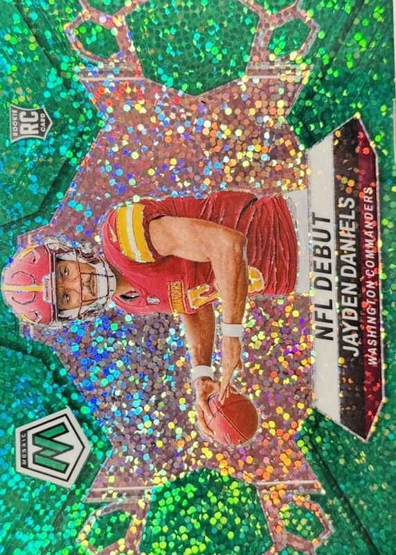 The Jayden Daniels 2024 Mosaic #272 NFL Debut - Green Sparkle /8 Rookie card in Raw condition has not changed in price in the last 30 days and was last sold for $850.00 .