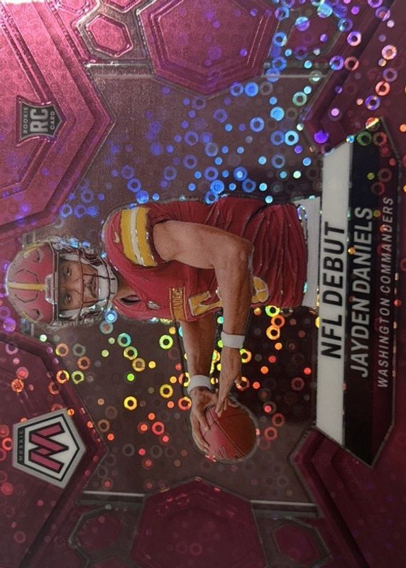 The Jayden Daniels 2024 Mosaic #272 NFL Debut - No Huddle Pink /20 Rookie card in Raw condition has not changed in price in the last 30 days and was last sold for $260.00 .