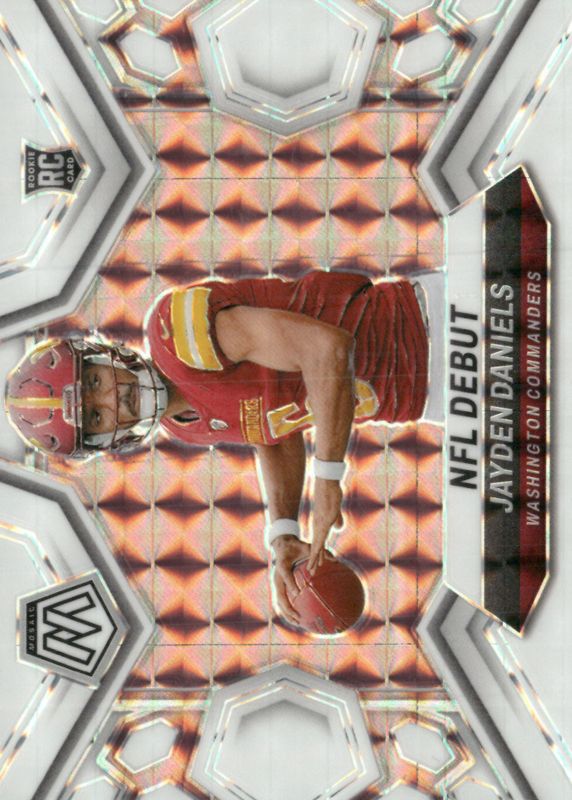 The Jayden Daniels 2024 Mosaic #272 NFL Debut - White /25 Rookie card in Raw condition has not changed in price in the last 30 days and was last sold for $169.50 .