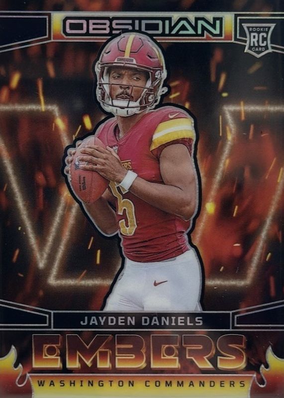 The Jayden Daniels 2024 Obsidian #2 Embers /(SSP) Rookie card in Raw condition has not changed in price in the last 30 days and was last sold for $185.50 .