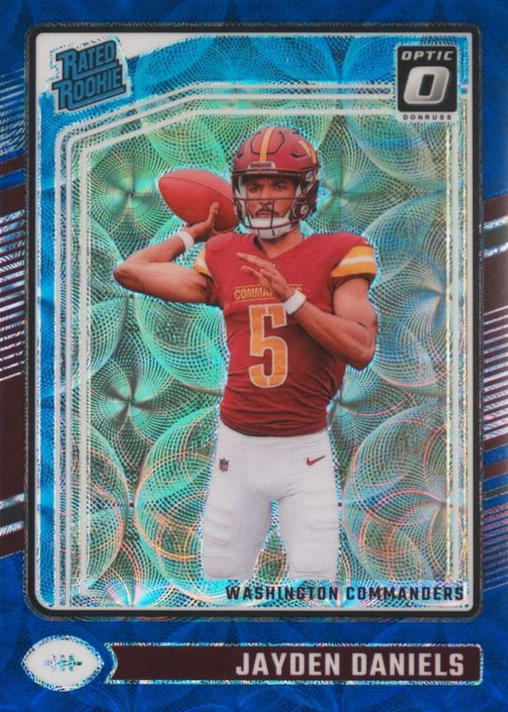 The Jayden Daniels 2024 Optic #248 Blue Scope Rookie card in Raw condition has moved down -$10.00 (-25.0%) in the last 30 days and was last sold for $30.00 .