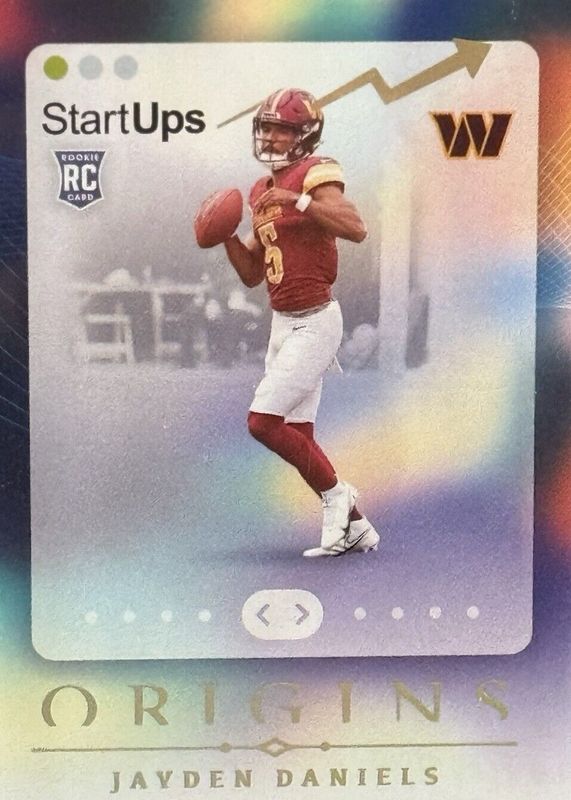 The Jayden Daniels 2024 Origins #18 Start-Ups Rookie card in Raw condition has moved up $10.00 (+100%) in the last 30 days and was last sold for $20.00 .