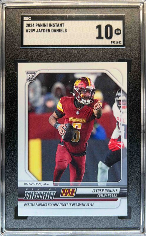 The Jayden Daniels 2024 Panini Instant #239 Base Rookie card is 1 of 49 Jayden Daniels' card variations in the 2024 Panini Instant set being tracked by Sports Card Investor, including #62 Base, #6 Base, #54 Base, #40 Base, and #30 Base.