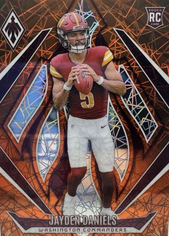 The Jayden Daniels 2024 Phoenix #198 Orange Lazer Rookie card in Raw condition has not changed in price in the last 30 days and was last sold for $14.01 .