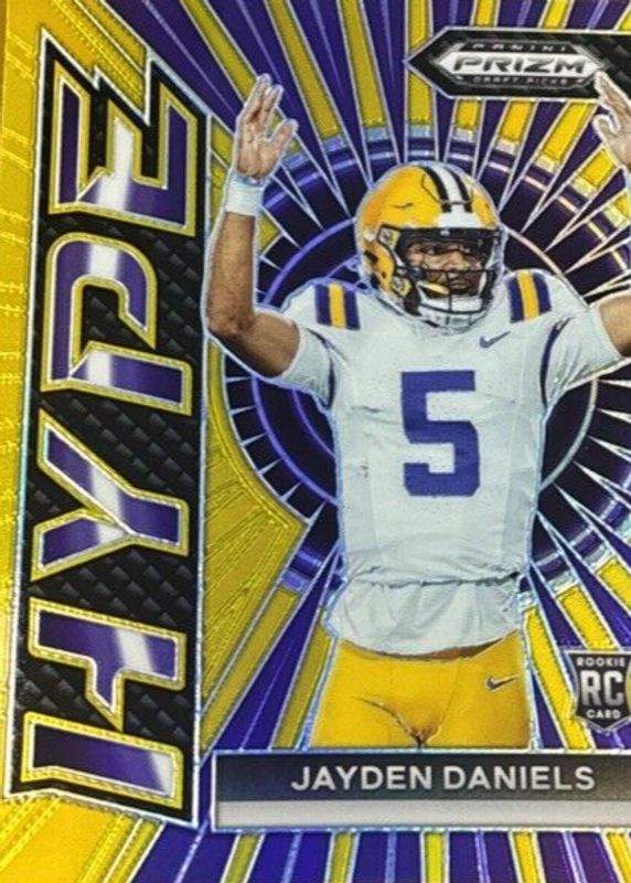 The Jayden Daniels 2024 Prizm Draft Picks #HP-JD Hype - Gold /10 Rookie card in Raw condition has not changed in price in the last 30 days and was last sold for $217.50 .