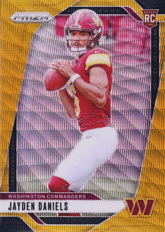 The Jayden Daniels 2024 Prizm #347 Gold Wave /10 Rookie card in Raw condition has not changed in price in the last 30 days and was last sold for $6,000.00 .