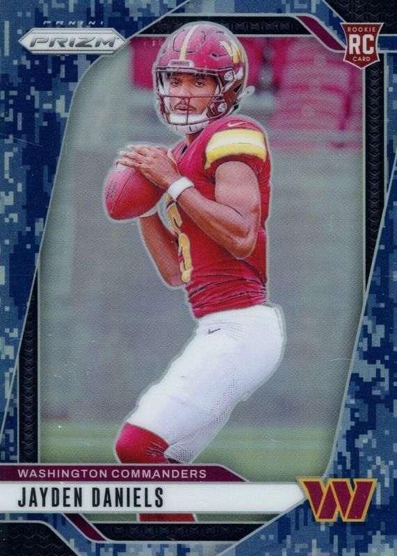 The Jayden Daniels 2024 Prizm #347 Navy Camo /25 Rookie card in Raw condition has not changed in price in the last 30 days and was last sold for $3,600.00 .