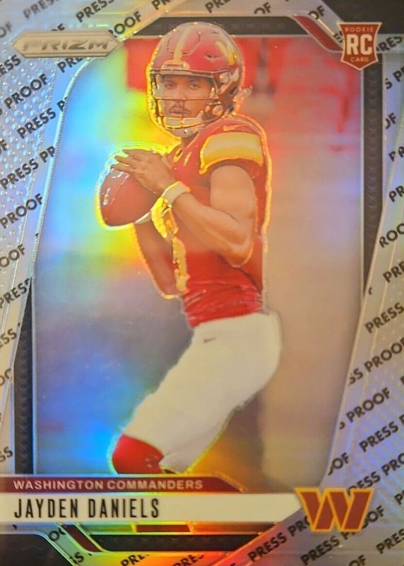 The Jayden Daniels 2024 Prizm #347 Press Proof /(SSP) Rookie card in Raw condition has not changed in price in the last 30 days and was last sold for $775.00 .