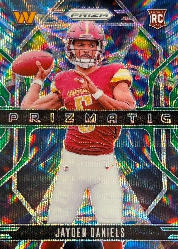 The Jayden Daniels 2024 Prizm #3 Prizmatic - Green Wave Rookie card in Raw condition has moved down -$4.51 (-82.0%) in the last 30 days and was last sold for $0.99 .