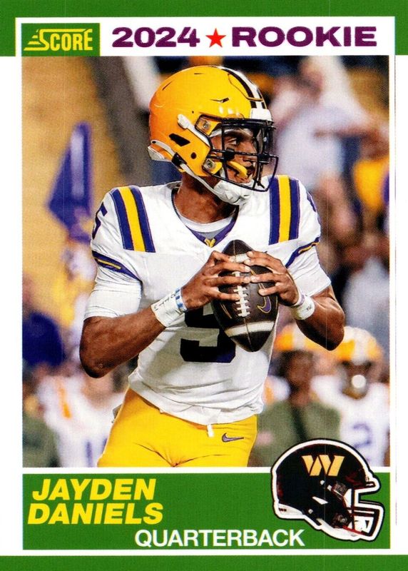 This card is 1 of 76 Jayden Daniels' card variations in the 2024 Score set being tracked by Sports Card Investor, including Base, Gold, Green, Orange, and Purple.
