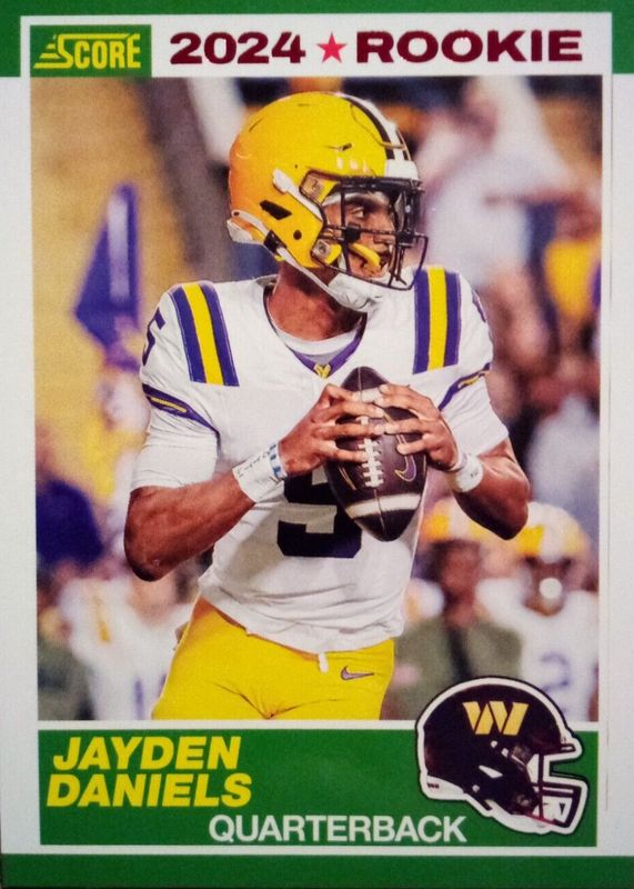 The Jayden Daniels 2024 Score #2 35th Anniversary Rookie - Red card in Raw condition has not changed in price in the last 30 days and was last sold for $1.00 .