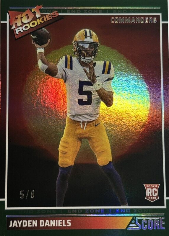The Jayden Daniels 2024 Score #4 Hot Rookies - End Zone /6 card in Raw condition has not changed in price in the last 30 days and was last sold for $338.00 .