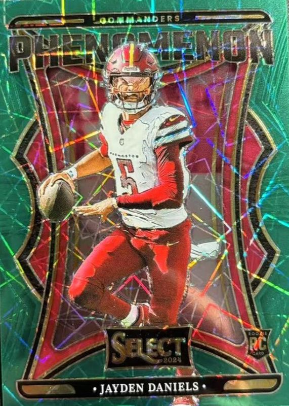 The Jayden Daniels 2024 Select #2 Phenomenon - Green /5 Rookie card in Raw condition has not changed in price in the last 30 days and was last sold for $760.00 .