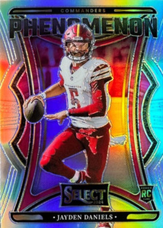The Jayden Daniels 2024 Select #2 Phenomenon - Silver Rookie card in Raw condition has moved up $5.84 (+138%) in the last 30 days and was last sold for $10.09 .