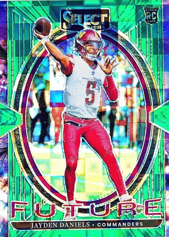 The Jayden Daniels 2024 Select #4 Select Future - Green /5 Rookie card in Raw condition has not changed in price in the last 30 days and was last sold for $606.45 .