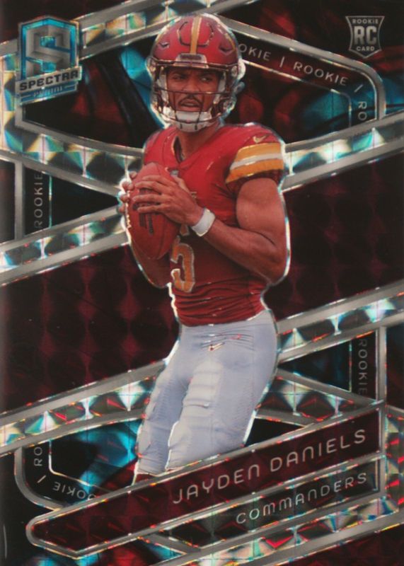 The Jayden Daniels 2024 Spectra #115 Interstellar /60 Rookie card in Raw condition has not changed in price in the last 30 days and was last sold for $142.00 .