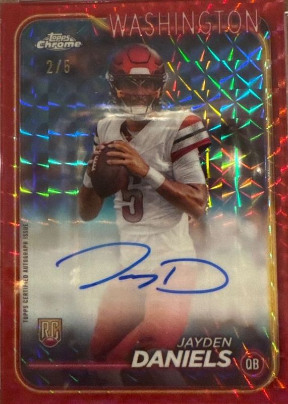Auctions Ending Soon for Jayden Daniels 2024 Topps Chrome #RA-JDA Rookie Auto - Red Geometric Refractor /5 RAW