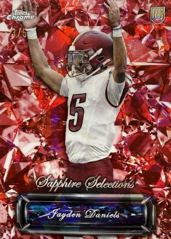 The Jayden Daniels 2024 Topps Chrome Sapphire Edition #SS-2 Sapphire Selections - Red /5 Rookie card in Raw condition has not changed in price in the last 30 days and was last sold for $700.00 .