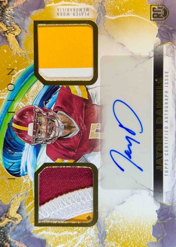 The Jayden Daniels 2024 Topps Inception #FFRA-JD Franchise Foundation Relic Autographs - Gold /25 Rookie card in Raw condition has not changed in price in the last 30 days and was last sold for $574.95 .