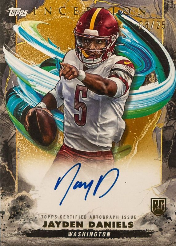 The Jayden Daniels 2024 Topps Inception #RA-JD Rookie Autographs - Gold /25 card in Raw condition has not changed in price in the last 30 days and was last sold for $1,000.00 .