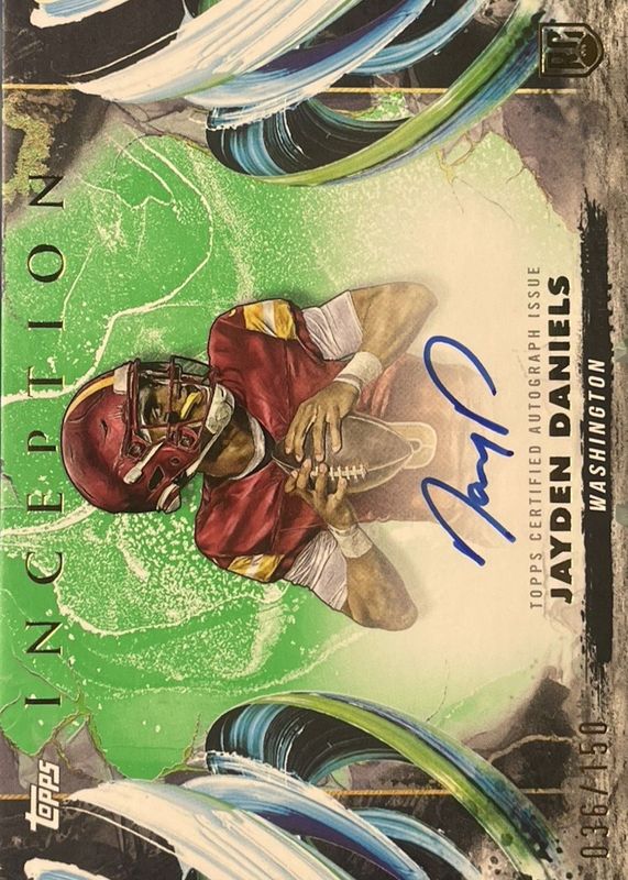 The Jayden Daniels 2024 Topps Inception #RA-JD Rookie Autographs Variation - Green /150 card in Raw condition has not changed in price in the last 30 days and was last sold for $396.81 .