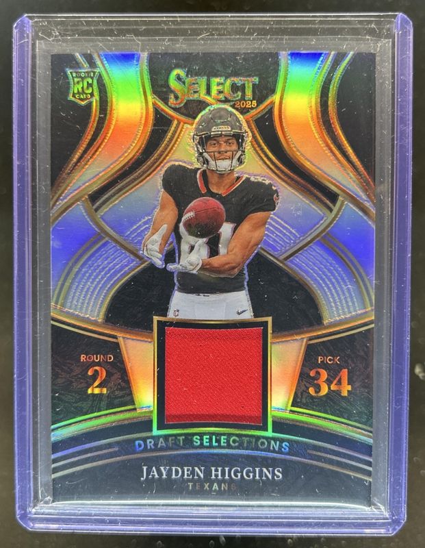 The Jayden Higgins 2025 Select #DSM-JHS Draft Selections Memorabilia - Silver /149 Rookie card is 1 of 183 Jayden Higgins' card variations in the 2025 Select set being tracked by Sports Card Investor, including Field Level, Premier Level, Field Level Silver, Premier Level Black & Blue Shock, and Premier Level Black & Gold Shock.