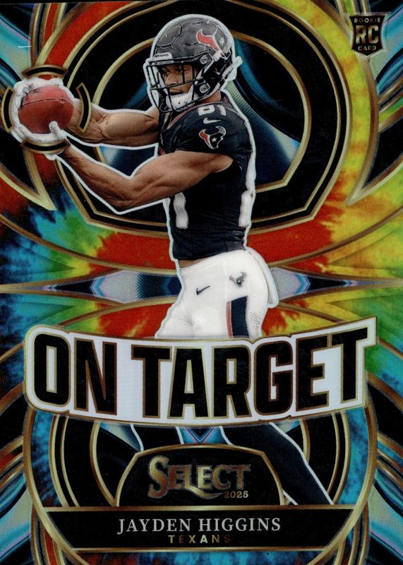 The Jayden Higgins 2025 Select #11 On Target - Tie-Dye /25 Rookie card in Raw condition has not changed in price in the last 30 days and was last sold for $85.00 .