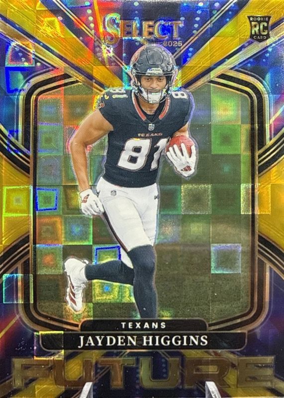 The Jayden Higgins 2025 Select #7 Select Future - Gold /10 Rookie card in Raw condition has not changed in price in the last 30 days and was last sold for $200.00 .