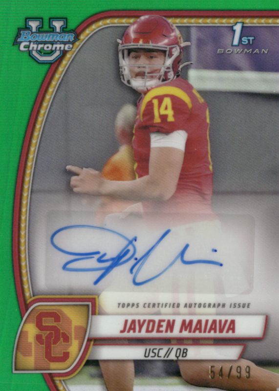 Best Prices Available For Sale of Jayden Maiava 2024 Bowman Chrome University #PA-JMA Prospect Auto - Green Refractor /99 (1st)