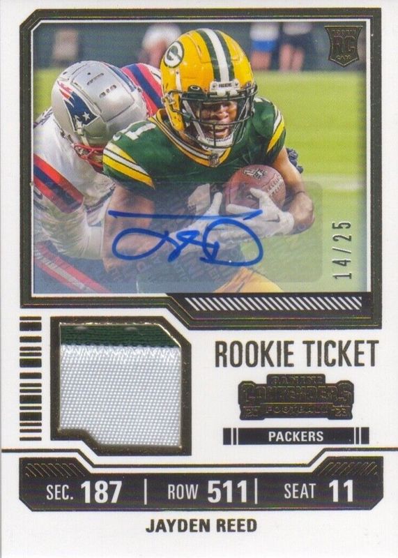 The Jayden Reed 2023 Contenders #TS18 Rookie Ticket Swatches Autographs /25 card in Raw condition has not changed in price in the last 30 days and was last sold for $50.00 .