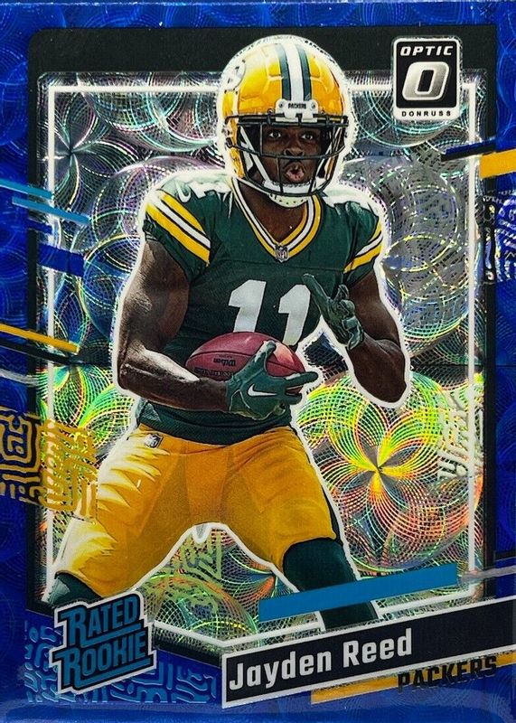 The Jayden Reed 2023 Donruss #334 Optic Preview - Blue Scope Rookie card in Raw condition has not changed in price in the last 30 days and was last sold for $5.99 .
