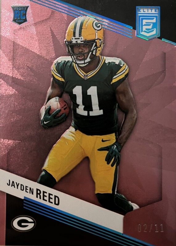 This card is 1 of 34 Jayden Reed's card variations in the 2023 Elite set being tracked by Sports Card Investor, including Base Rookie /999, Aspirations (/89), Green Disco, Pink, and Status (/11).