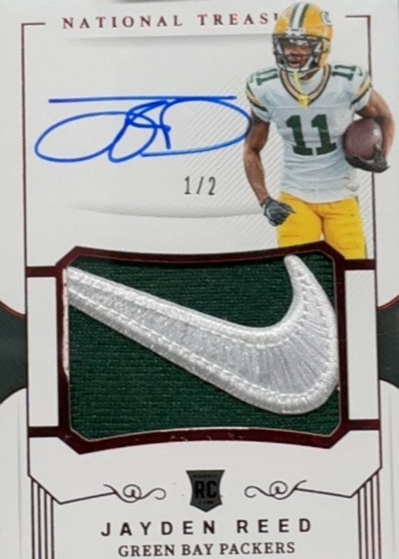 The Jayden Reed 2023 National Treasures #CRPA-JRE Crossover Rookie Patch Autographs - Brand Logo /2 card in Raw condition has not changed in price in the last 30 days and was last sold for $306.00 .